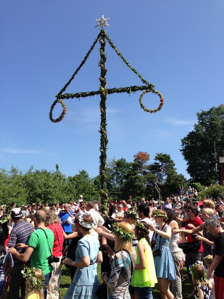 Traditions include eating many different kinds of herring, drinking schnapps and grown ups jumping around a huge pole dressed with flowers singing the song "Little Green Frogs" pretending they are tiny frogs. "Little Frogs" is like the grand finale of a rock concert and the leader of the dance was panting with exhaustion and could only sing every other word in the end. Brining your kids is just an excuse for the adults to participate. Another classic Midsummer tradition is that it usually starts raining in the middle of your outside dinner even if there are blue skies and shining sun just 10 minutes earlier!