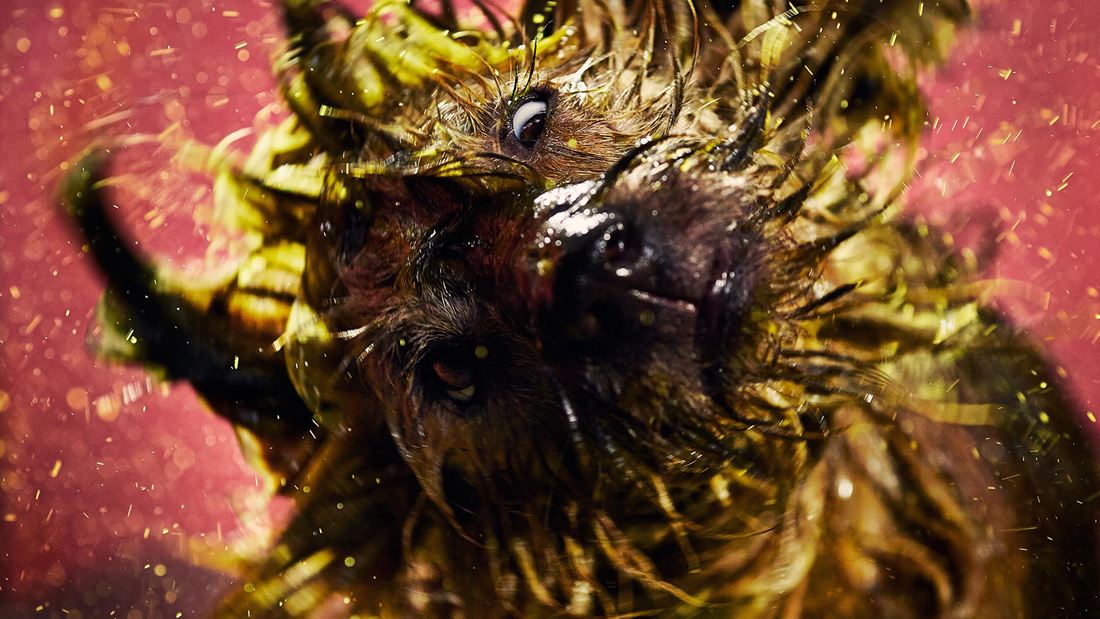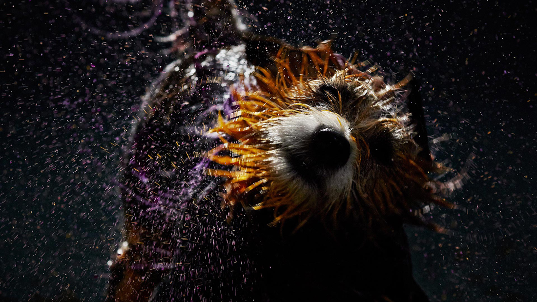 Four shelter dogs are recorded using both high-speed photography and slow-motion video as they shake off different colors of non-toxic paint. The video is being used for promotional purposes, and the photographs capture the dogs in mid-shake as the paint flies in a thousand directions.