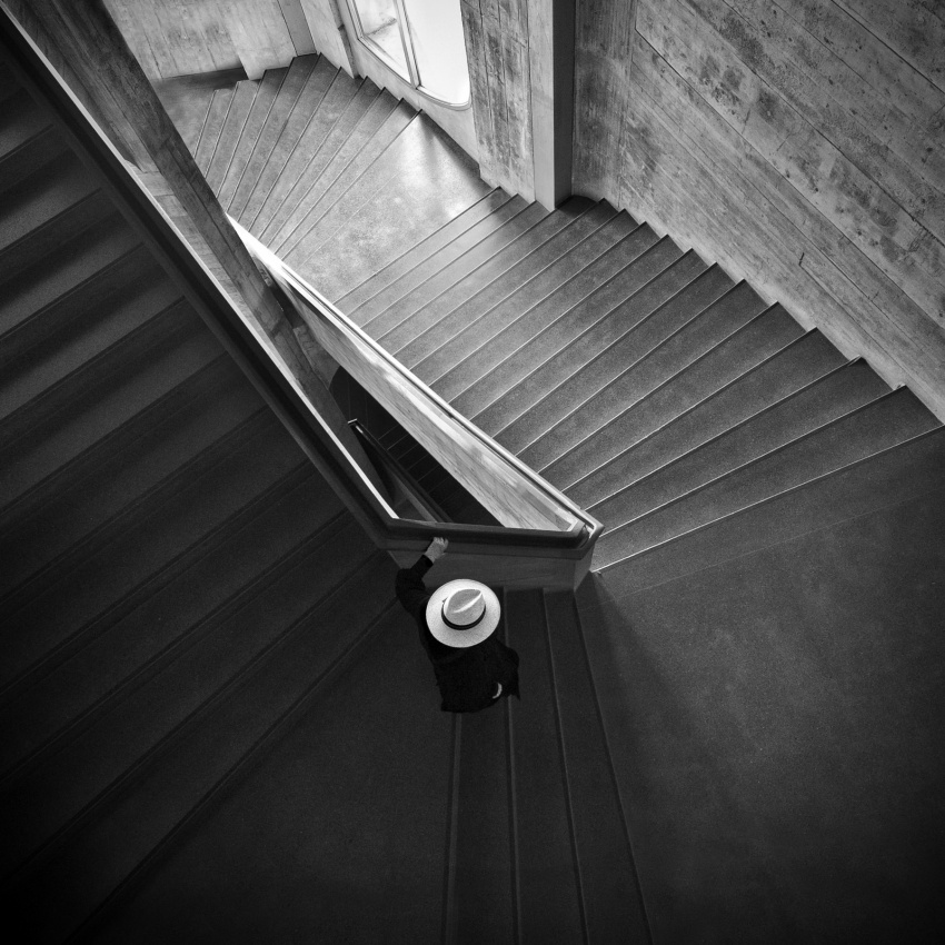 Equipment: Initially, any reasonably current DSLR or mirrorless camera is suitable. With a standard lens such as 24-70mm focal length (full frame) it is possible to shoot in wide-angle (e.g. for stairs) or with a slight telephoto (e.g. for details). If you notice that architectural photography is what you like, I would recommend an ultra wide angle lens with at least 16mm focal length (full frame). With such a lens, one can catch more of your subject within the frame (e.g. stairs) and also can use the wide-angle-effect, where objects close to the camera appear much larger than they are in reality. My Pictures "6",  "Curve", "Bricks” and “Lady with hat" would not have been possible  without a lens with extremely short focal length. The lamp in “5” and the windows in “Bricks” did also profit from the wide-angle-effect.