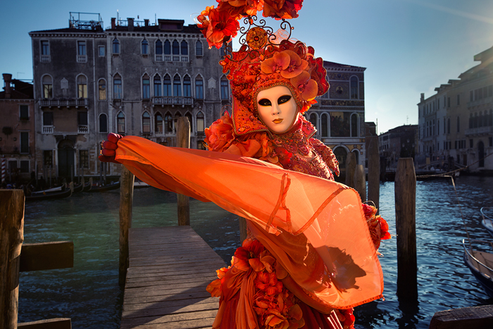 The opportunity arose a few years later, testing out and writing an article about Canon’s new flagship D-SLR, the 1DsMkIII. I booked myself on Charlie Waite’s company “Light and Land” Venice workshop in 2008. It turned out to be an overwhelming experience for the senses. Carnevale photography is often frantic for first timers. It’s most often the case of ‘shoot first, think later’. There are literally thousands of photographers; being able to think straight and creatively in such circumstances is difficult. Even so, I came away with many photographs that I was happy with. My photo “The Great Show” of Arnaldo, one of the most famous Carnevale masks became quite well known that year.