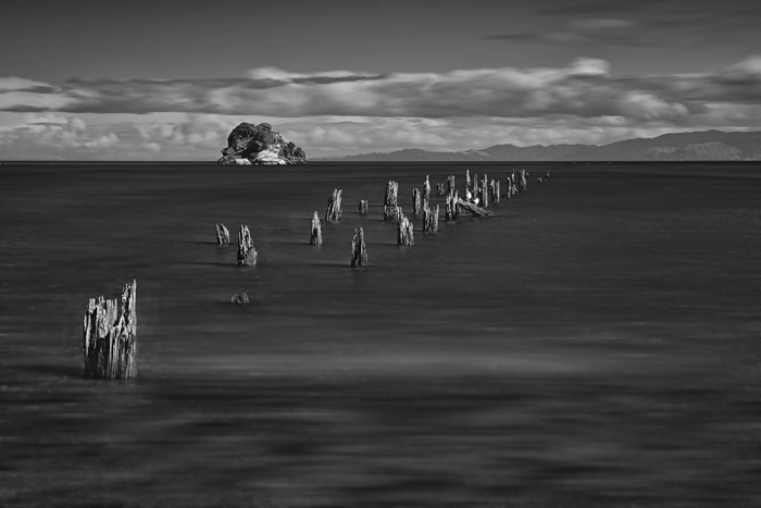 Another interesting spot I think is an unnamed area on the seaside along Collingwood-Puponga Main Road, where a line of rotten jetty legs gives a highlight during the change of tides.