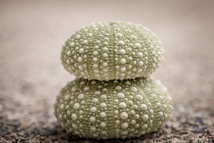 Jeff Hewson found these two sea urchin shells on the beach of Orewa, in the North of New Zealand. They are so small that both could almost fit into a match box. He took them home together with some sand from the beach.
