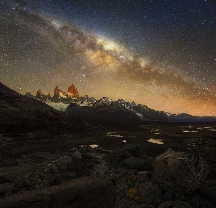 This image captures the moonlight phenomenon. What makes this image so special is that the Milky Way had moved towards the mountain peaks by the time the Fitz Roy peaks were lit up by the rising moon. The entire process of taking this image took me 15 hours. According to the calculation from the app “PlanIt! for Photograhers”, the chances of capturing the Milky Way and the rising moon over the red peaks of Fitz Roy were very slim, the event probably occurs less than 5 times throughout a calendar year in Los Glaciares National Park.