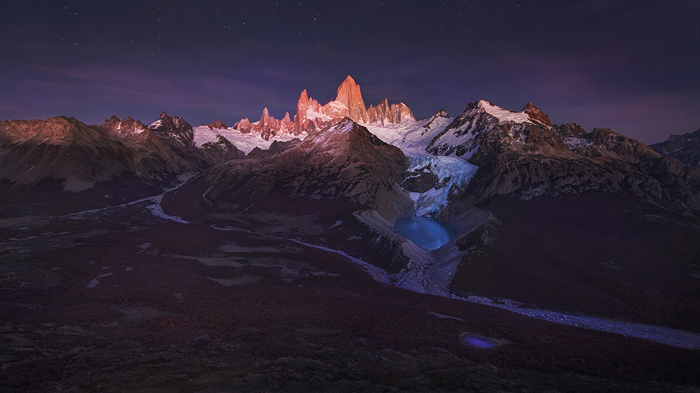 When the camera completed the last exposure, I browsed through the shots in a backward order. In the last few shots, I noticed the Fitz Roy peaks glowing brightly in the dark. I lifted my head up to the sky and saw the peaks still translucent in the night. At the same time, the moon was rising behind me – this was an amazing natural phenomenon caused by moonlight.