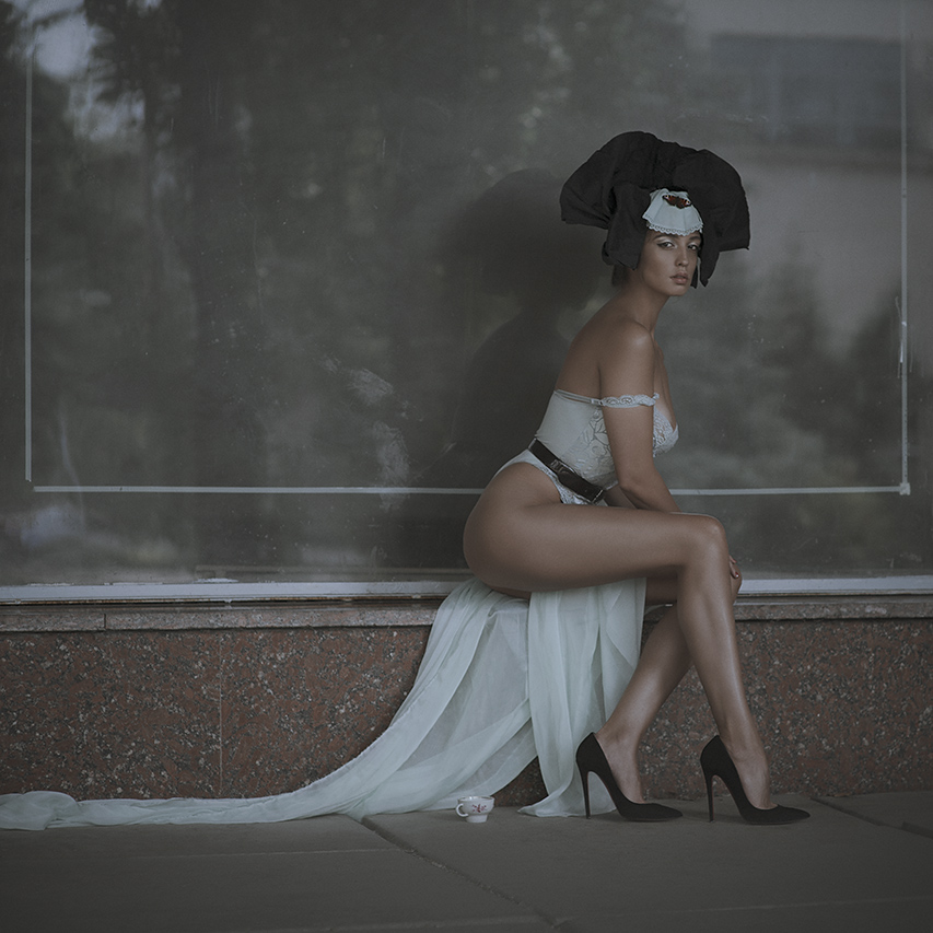 Another work among our favorites is a lady in a fountain with a teapot in her hands – ‘Secret Garden’. Sensual bodylines of a woman in a contrast morning light, also a black and white image. It was late March and the snow was still around. Cold air and dazzling light. As we used to work on open-air locations most of the time, there are always some passers-by or just curious people. Despite all these, the model conveyed necessary expression and emotion under our direction of the scene.