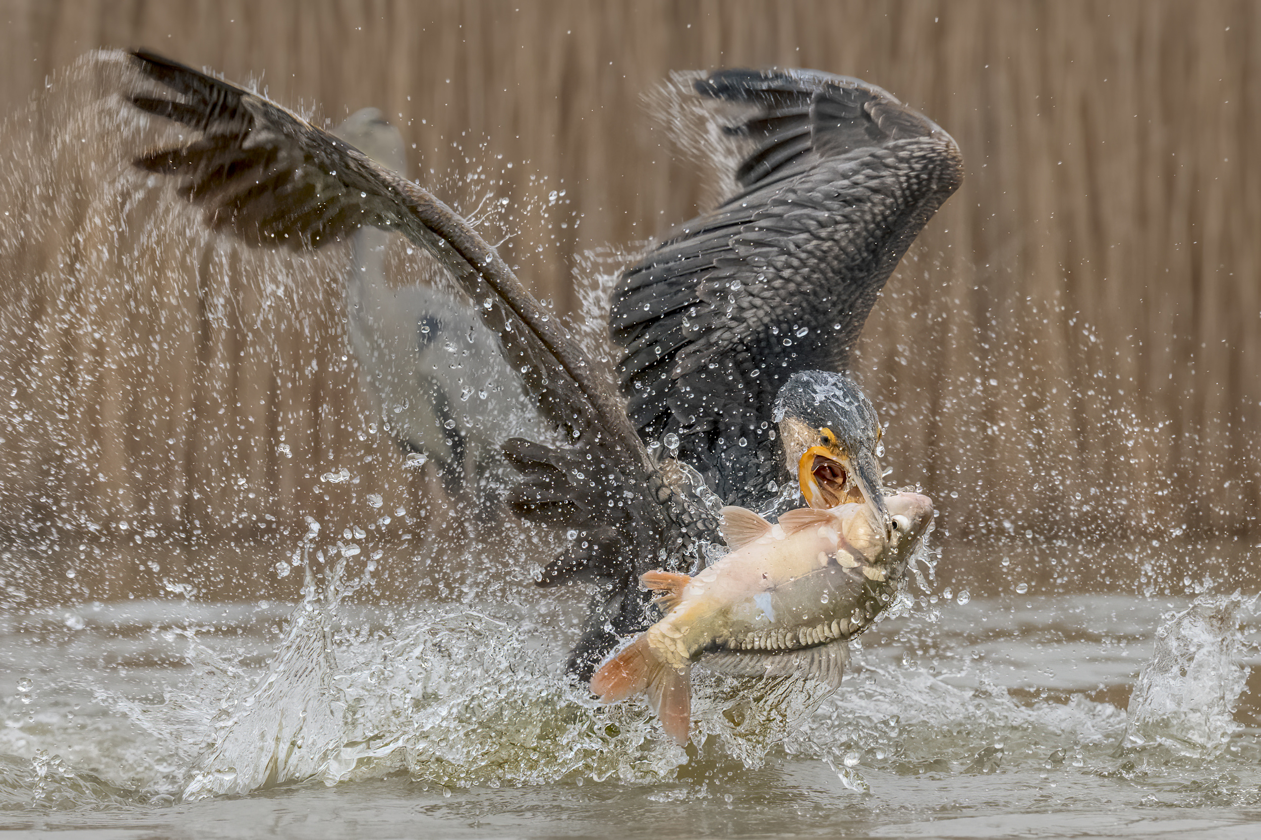 When the cormorant is near suitable prey, it pounces on the fish and grabs it in its beak. It usually brings its prey to the surface, flattens it in its beak and swallows it in one go. Great Cormorant catches all kinds of fish, such as herring, plaice, cod or eels, which it discovers at depths of up to ten metres.