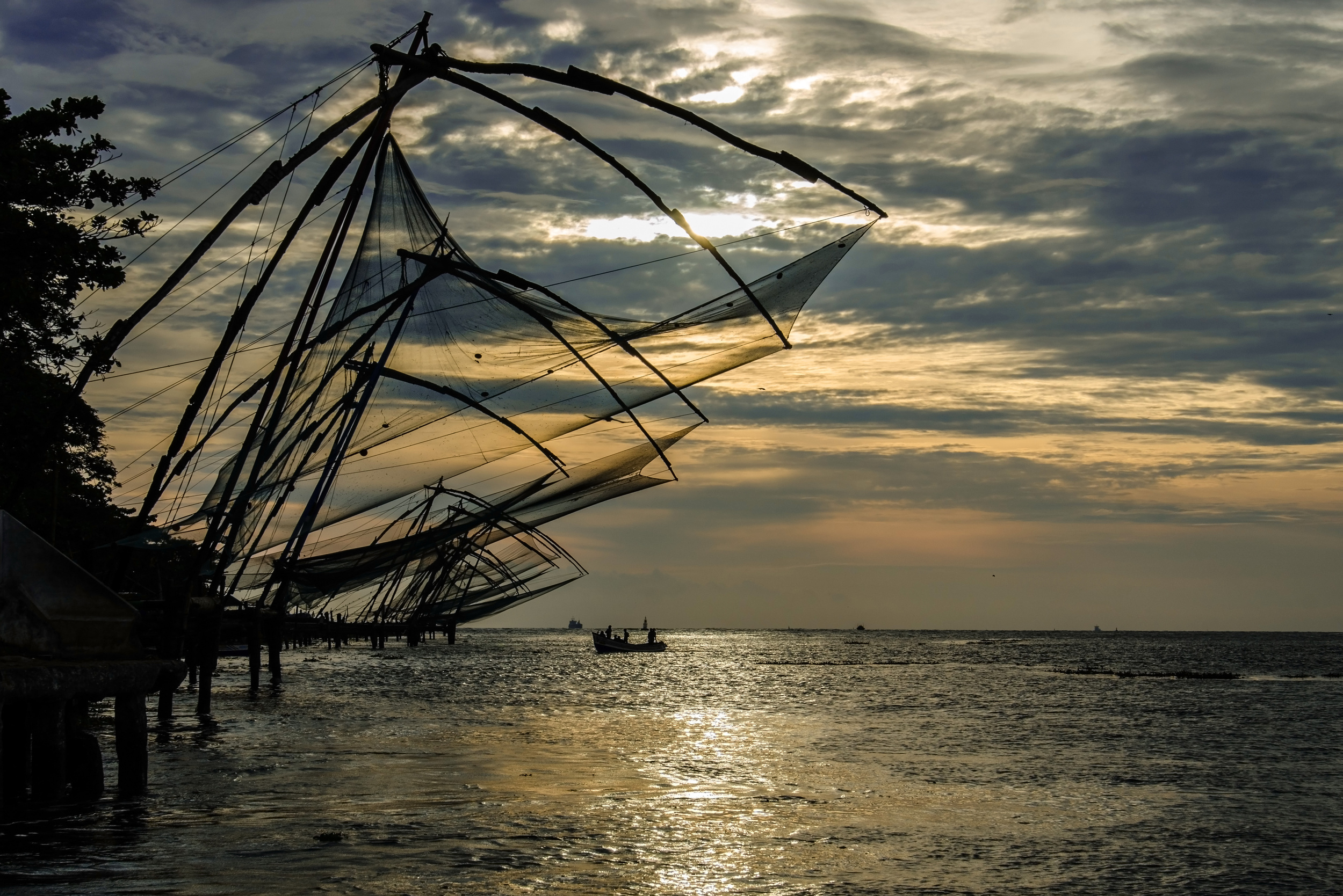 The weight of a man walking on the main beam is enough to let the net sink into the sea. When the net is full of fish, the fishermen pull it back into the boat. After catching the fish, people can choose which ones they want and then have them cooked at one of the stalls. These fishing nets were set up on the shores of Kochi between 1350 and 1450 AD.