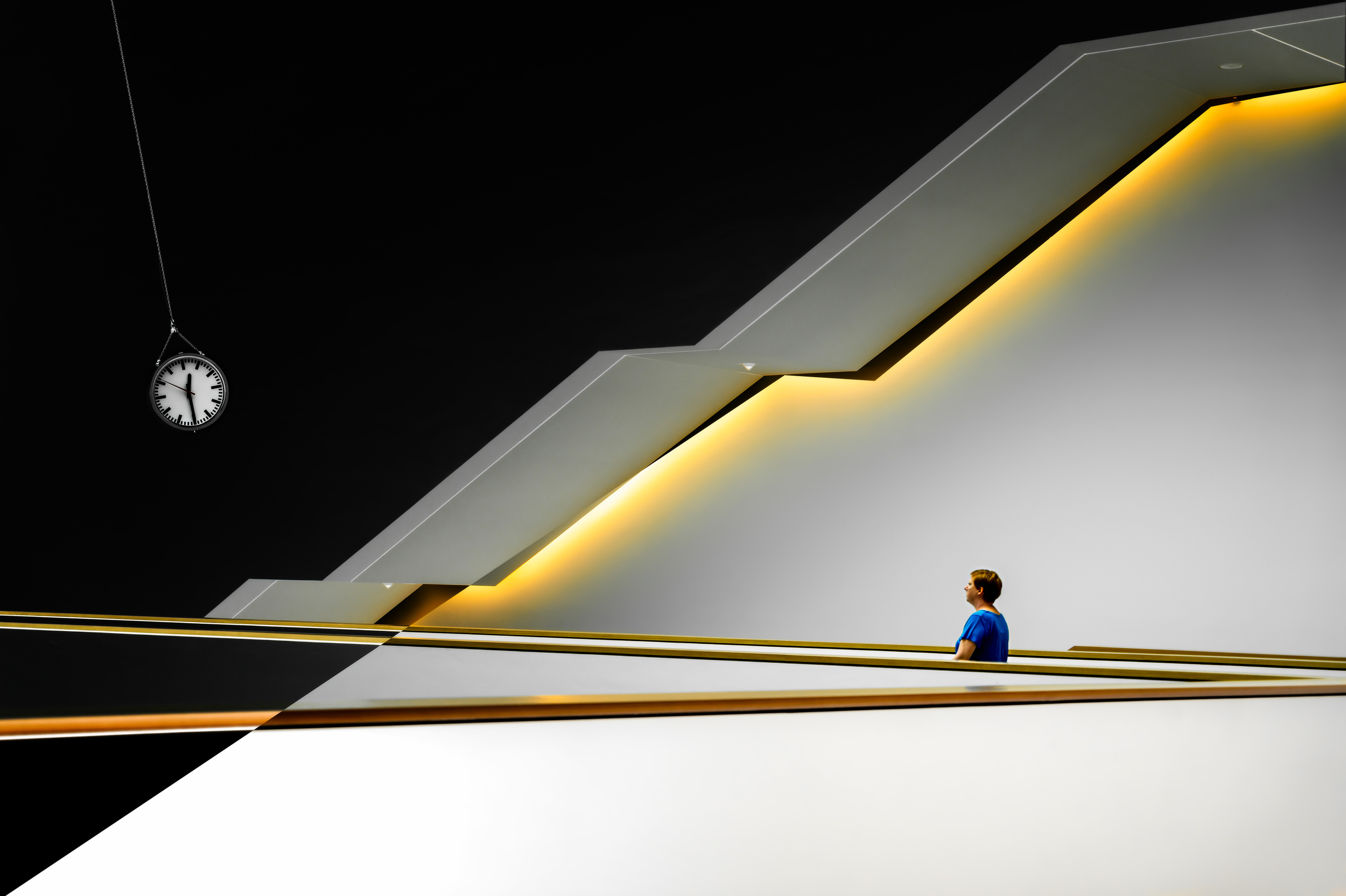 My photo shows a visitor on the staircase who is fascinated by this art work. I was fascinated by this situation, too. At the same time, I was impressed by the graphic effect of the architecture and the presence of numerous geometric shapes. To enhance this effect, I split the photo diagonally and turned one half into a negative, thus resulting in more geometric shapes and a surreal overall impression.