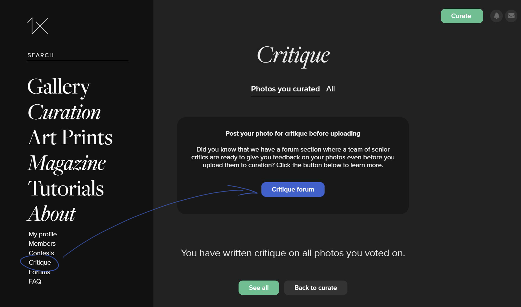 2. The Blue Button you see when selecting Critique from the side bar menu will lead you to the 'Critique Forum', which is a very different, not anonymous place for in-depth feedback – ideally before curation. Here the Senior Critics (and sometimes members) go into more detail and can often suggest ideas or techniques to improve a photo. Some members use this service to fine-tune an image before it's sent to curation. Usually two or three of the Senior Critics will have a close look at your photo and tell you what they see - what works in the image, and what could be improved. They are not anonymous, so you'll know who is writing to you. All 1X members are welcome to join in these discussions.