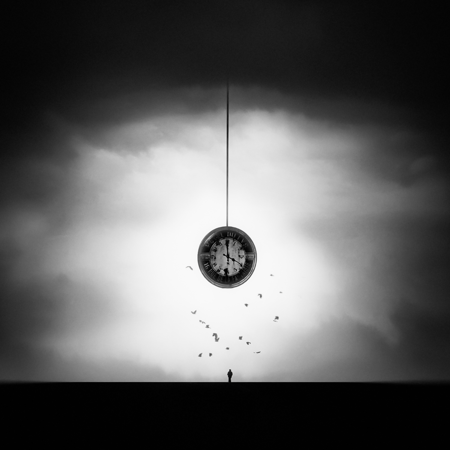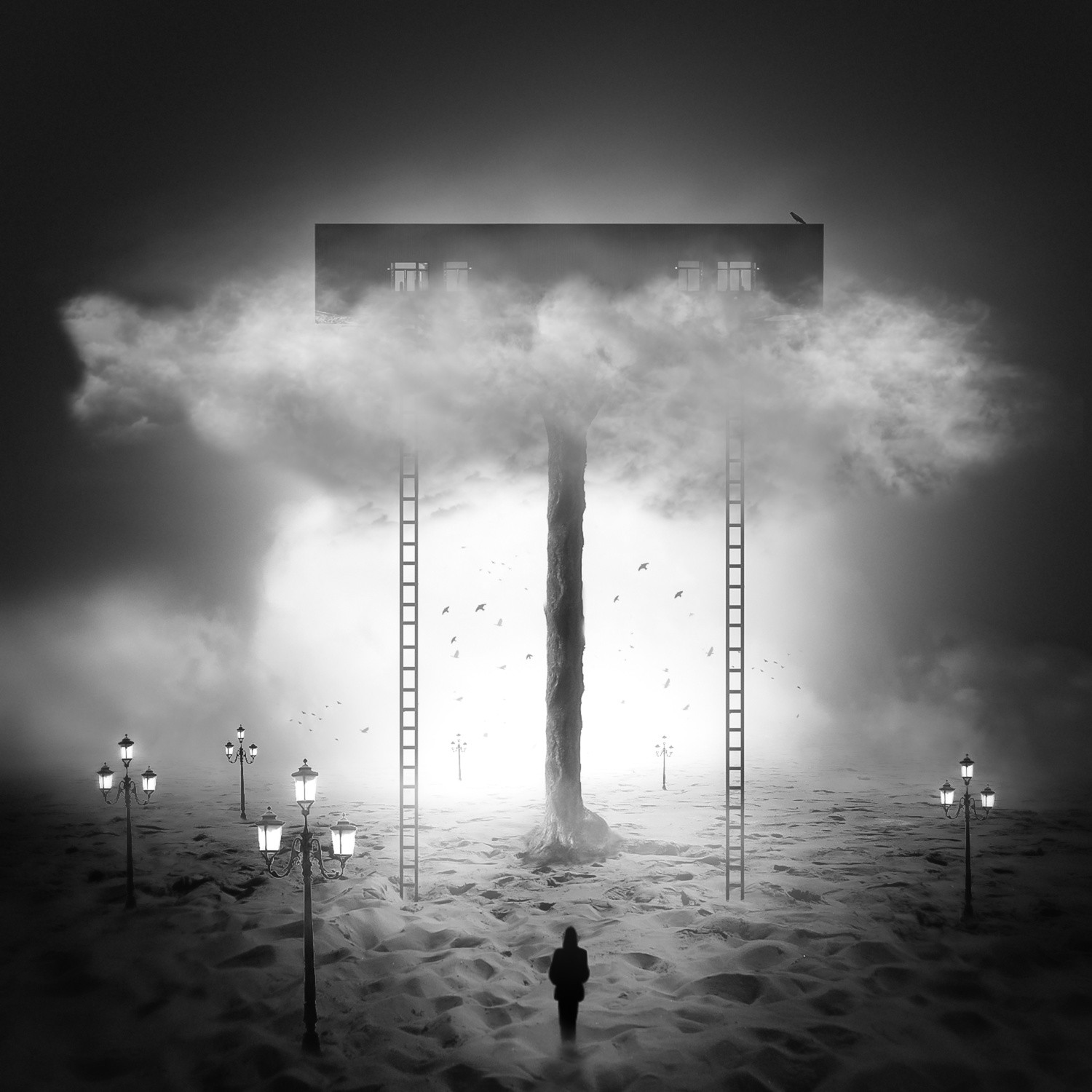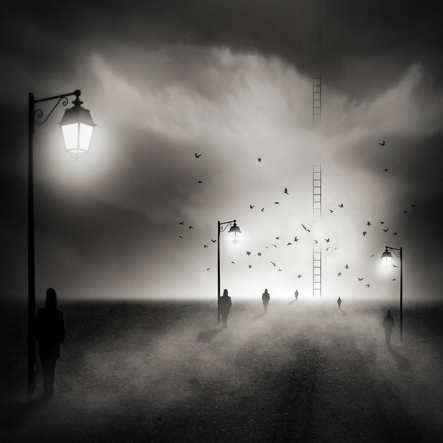 Digital image creation offers me the possibility to transform my visions into images. If I see an idea with my inner eye, I try to develop it creatively. To create emotions in my works, I like to use powerful black and white contrasts, with strong contrasts in the depiction of the size of objects and with an interesting lighting design. I often use objects such as clouds, birds, lamps and people as silhouettes, often represented very small.
