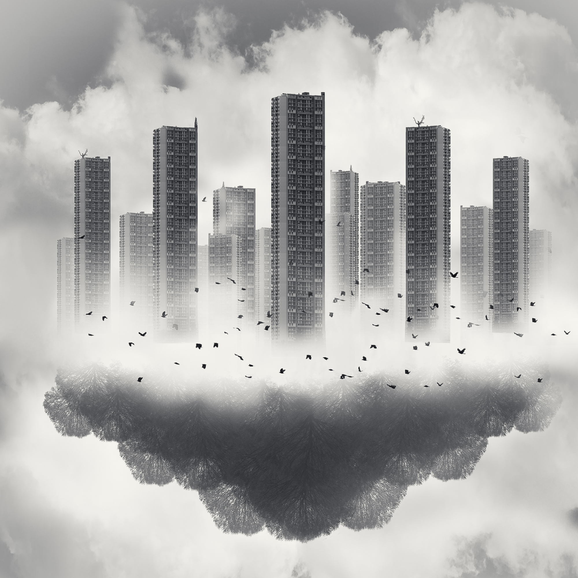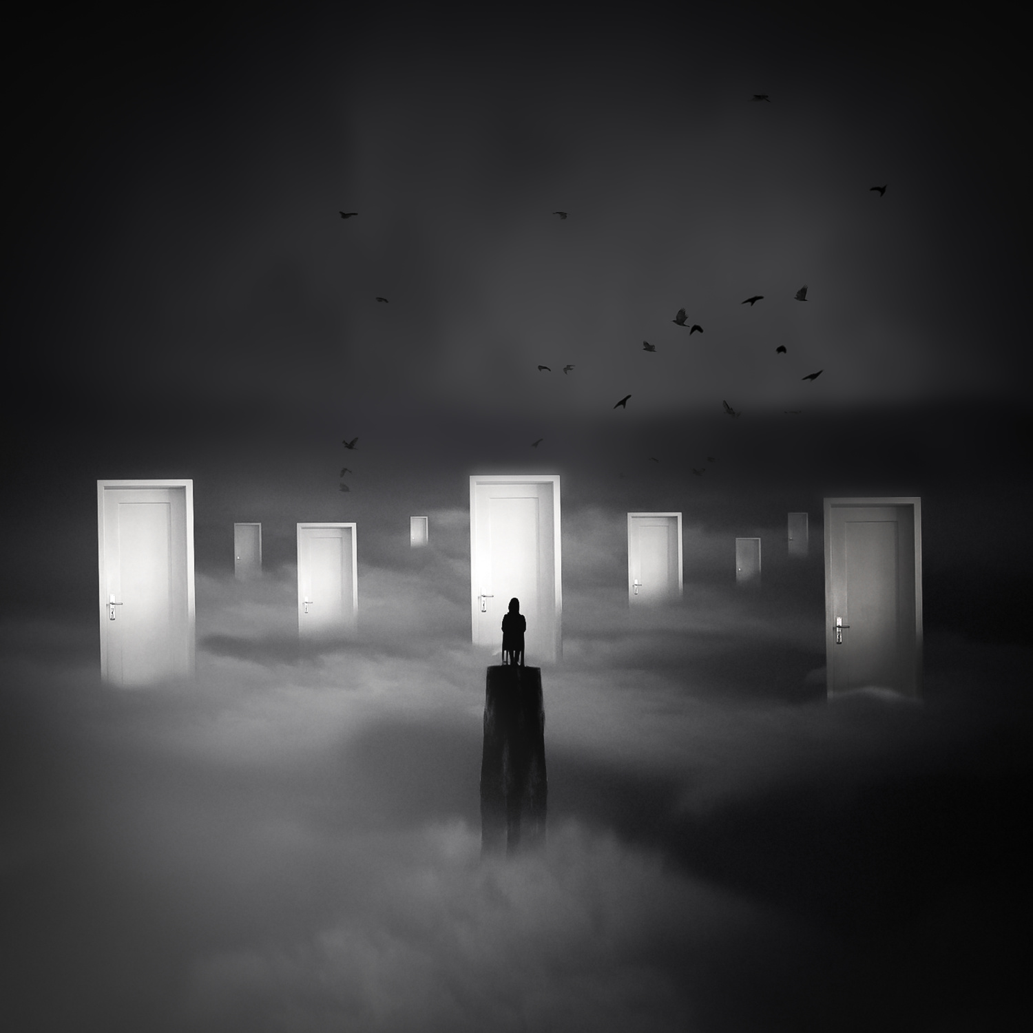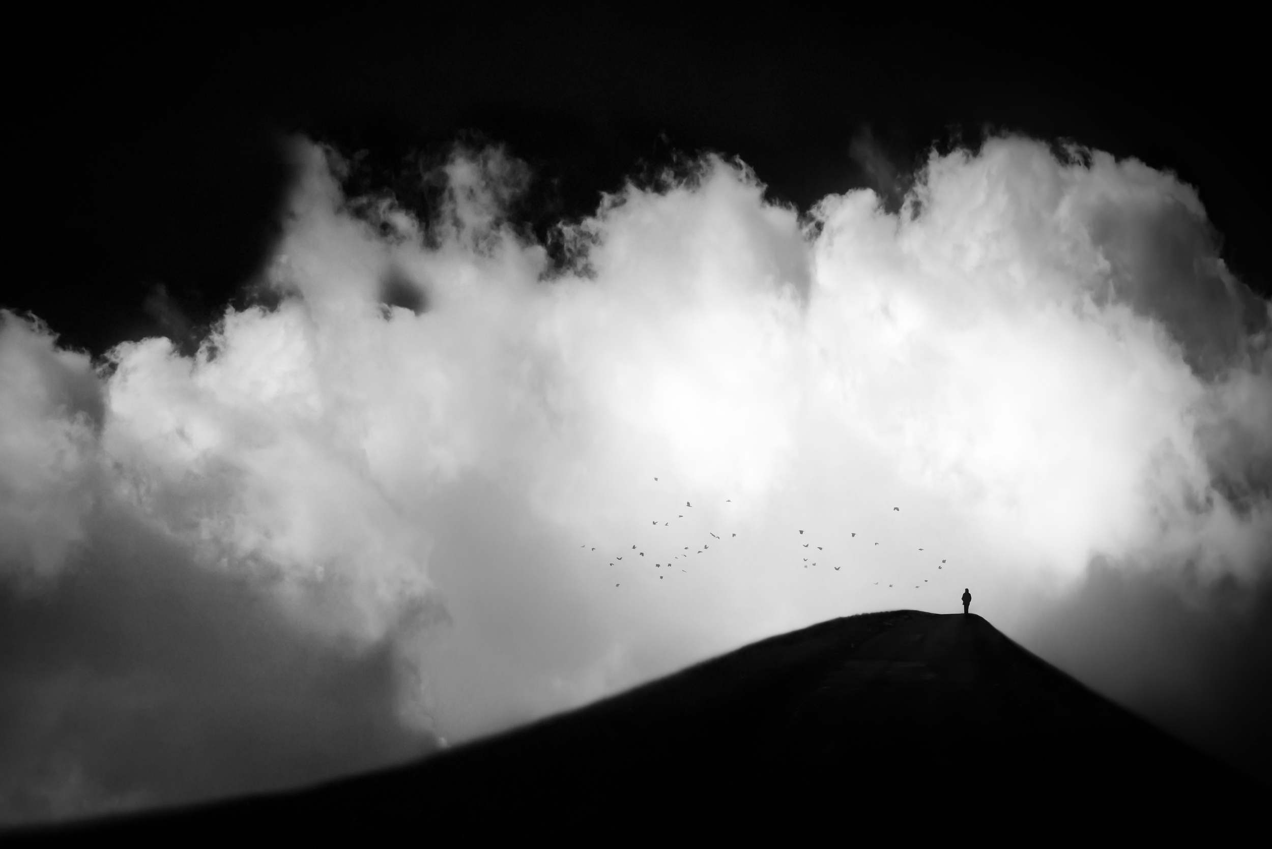 Digital image creation offers me the possibility to transform my visions into images. If I see an idea with my inner eye, I try to develop it creatively. To create emotions in my works, I like to use powerful black and white contrasts, with strong contrasts in the depiction of the size of objects and with an interesting lighting design. I often use objects such as clouds, birds, lamps and people as silhouettes, often represented very small.