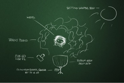Every portrait needs an atmosphere that completes it; otherwise, it would just be an ordinary shot.  In this particular case I told Tímea to play with her hair in a sensual way, and this introduced motion to the image, which always creates some kind of atmosphere.  A thorny bush, the setting winter sun and unusially warm weather in Translyvania were also useful element.