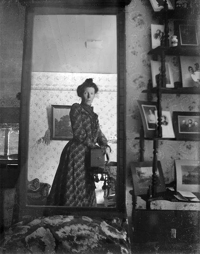 Unidentified woman taking her picture in a mirror, c. 1900