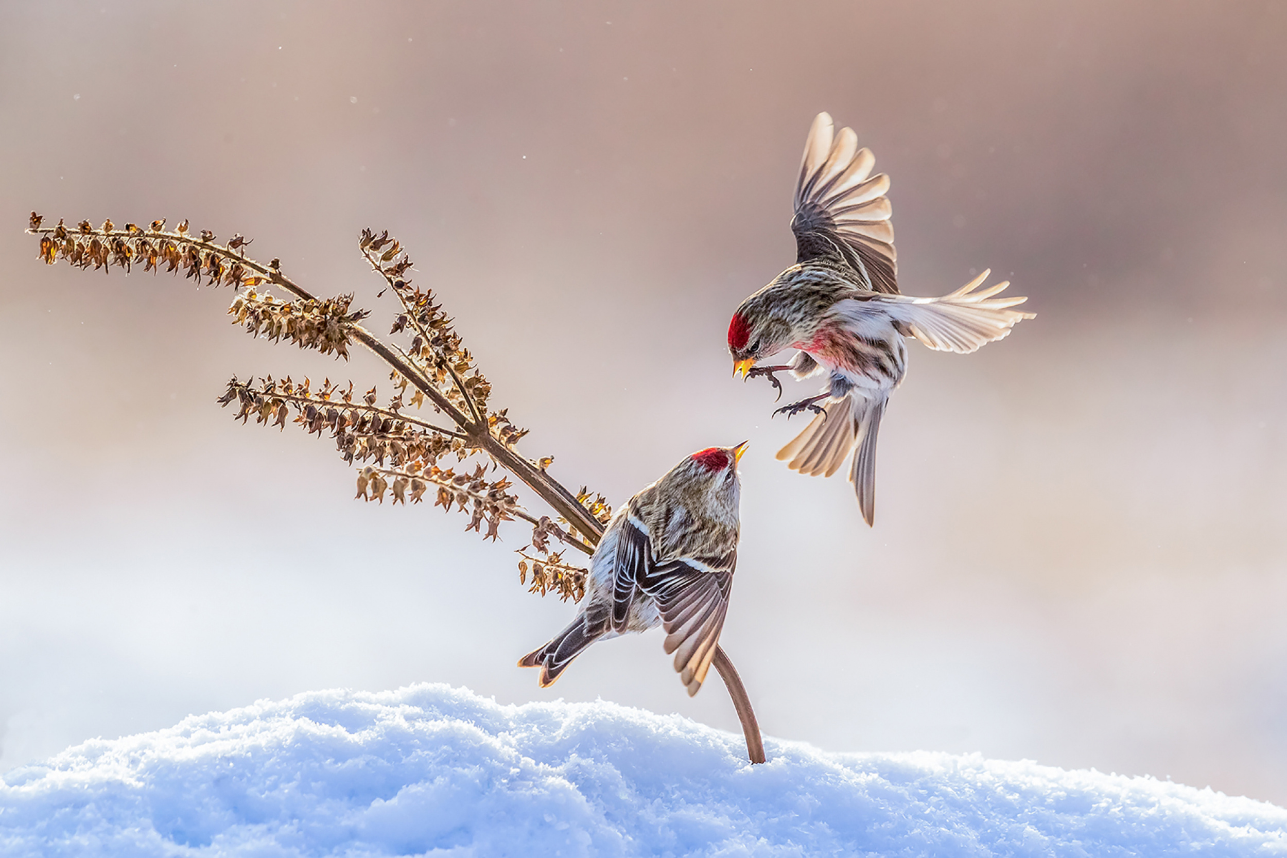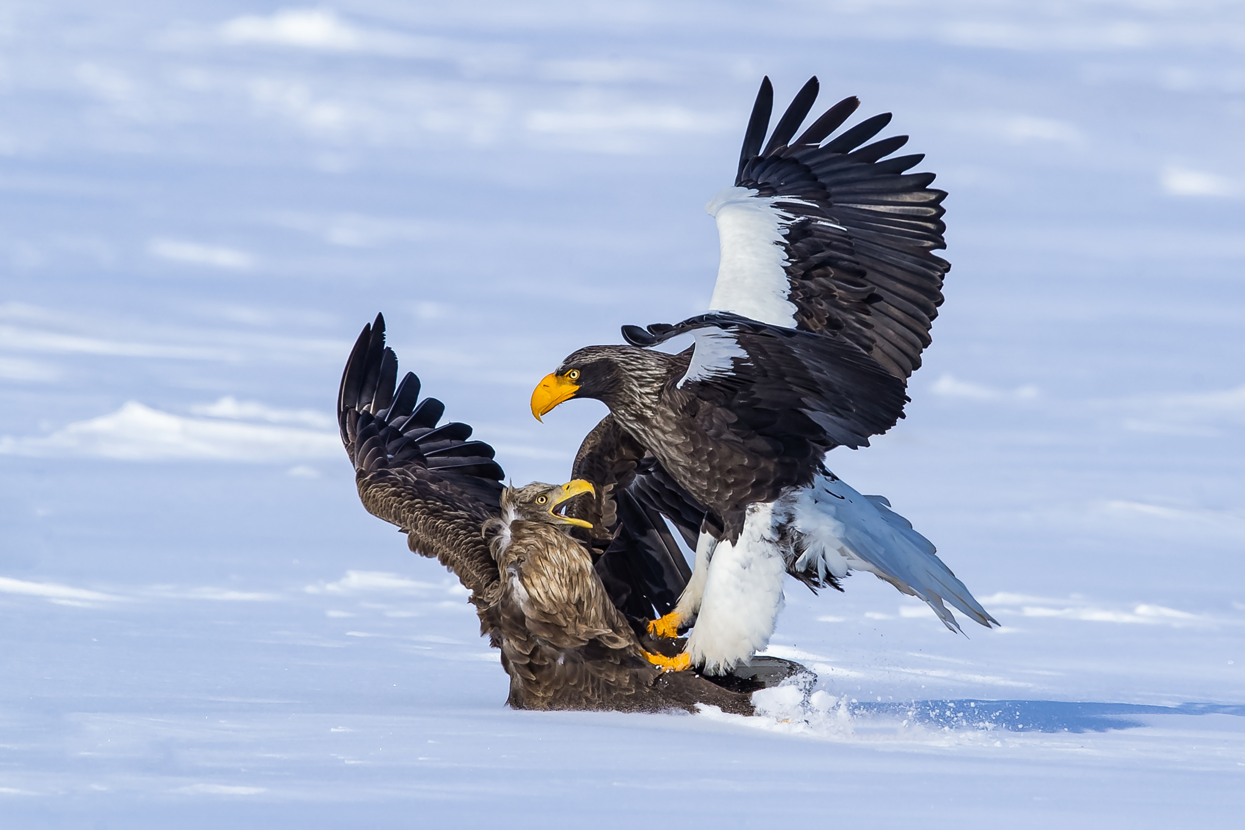 This is a beautiful image of the Tiger's Head Sea Eagle and the White-tailed Sea Eagle taken in 2018. This was the first time I won the PSA Gold Medal in the international photography competition. It is my most awarded work in the national and international photography competition and it is my favourite bird photography work. A tiger-headed sea eagle has just come down and stepped on the white-tailed sea eagle, which is eating alone. At this very moment, the two kings are fighting fiercely. The precise focus, the appropriate exposure, the lucky angle and other elements freeze this extraordinary moment of this battle.