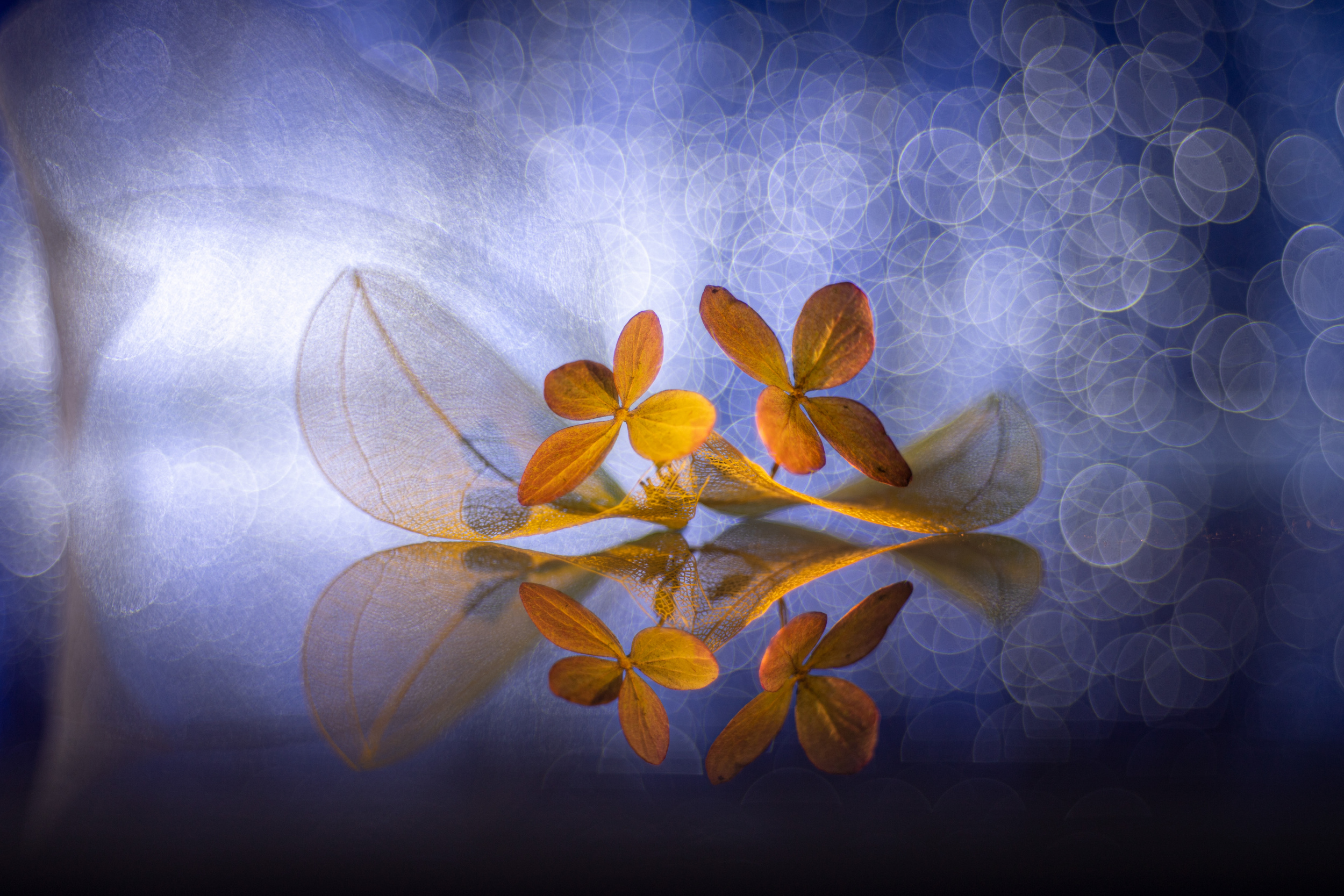 You need glass plates of at least 420 x 210mm so that their edges are not visible in the frame. I used two of them. One is vertical and the other horizontal, on which I placed the subject. I used skeletonised magnolia leaves, which I bought on the internet, and hydrangea flowers.