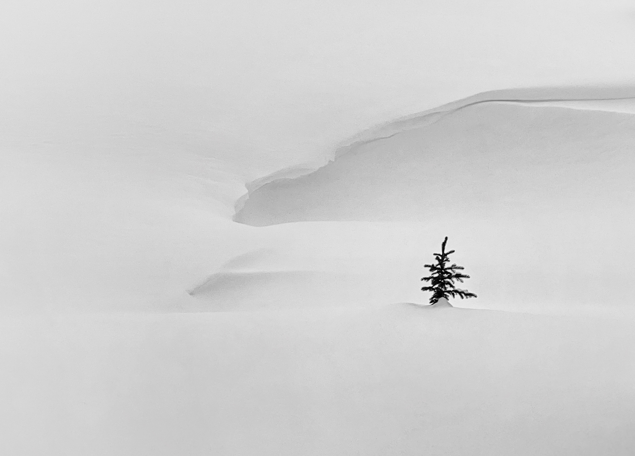This minimalist image was taken during a photography tour in Banff, Canada in December 2021, during the pandemic. It was snowing heavily on the day we went out to Bow Lake, with waist-deep snow and buried roads. Strong winds blew through the trees and blurred our vision. Visibility was so low that the team members had to stay close together. We walked very slowly in our snowshoes to find our way back. Suddenly, I noticed a tiny tree behind a ditch. The wind had formed a shelter around the tiny tree, embracing it like a safe home. It immediately warmed my heart. It reminded me of the lockdown that year, and it saddened me that we were unable to go back and see our families. It was just before Christmas, so the photo touched my heart every time I looked at it. It took me back to that snowy day, that memorable tour and all the winter 2021 memories.